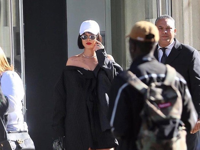 Bukan Rihanna namanya kalau tidak bisa menjadikan sesuatu yang aneh terlihat lebih fashionable dan nyentrik. Penyanyi 29 tahun itu memadukan high heels uniknya dengan jas oversized berpotongan dekonstruktif.
