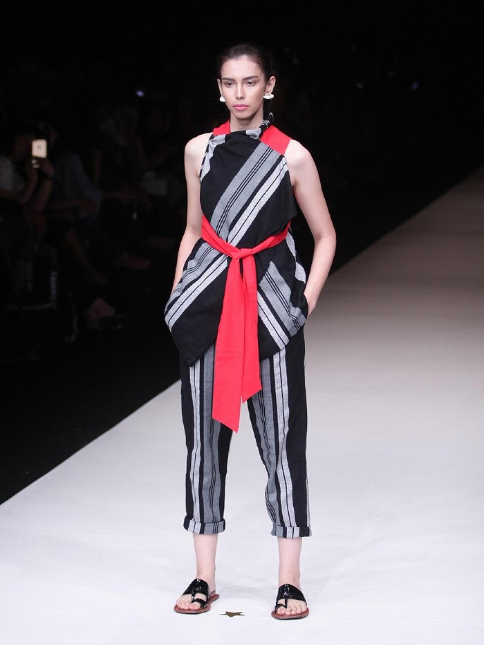 Desainer Lulu Lutfi Labibi mempersembahkan koleksi terbarunya di landasan peraga Jakarta Fashion Week 2018, Selasa (24/11/2017). Sebuah koleksi busana lurik bergaya kontemporer yang lahir dari rasa kecewa dan sakit hati sang desainer.