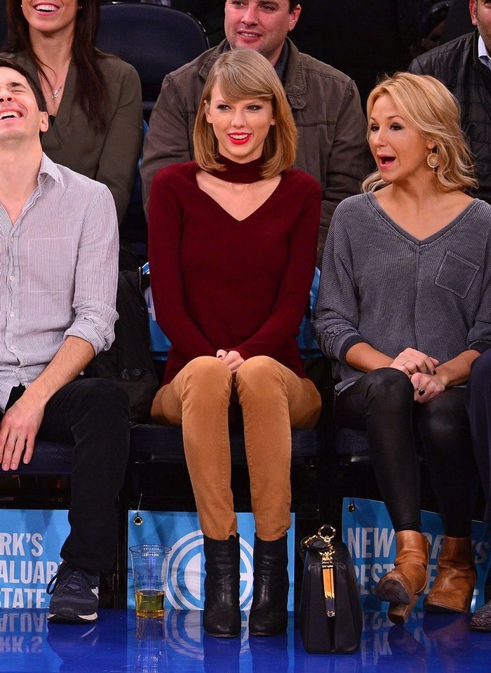 Di 2014, Taylor Swift pernah tampil untuk menyaksikan pertandingan basket bersama teman-temannya. Taylor mengenakan sweater V-neckline berwarna merah marun dari 525 America. Baju itu hadir dengan guntingan seperti choker di lehernya.