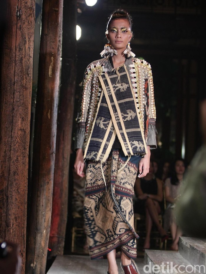 Tenun sumba yang memiliki karakter rustic atau lusuh nan eksotis terpadu ringan dengan material yang luks seperti silk lame, jacquard, ataupun katun.