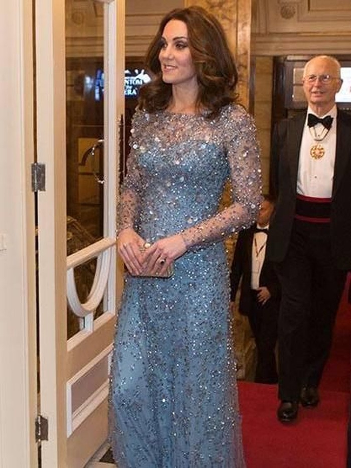 Berbeda dari penampilan Kate biasanya yang kerap dibalut gaun minimalis warna solid, kali ini Duchess of Cambridge tampil jauh lebih glamour. Kate memilih gaun ice-blue yang bertatahkan payet indah di atasnya, sementara Pangeran William dibalut tuksedo hitam yang gagah.