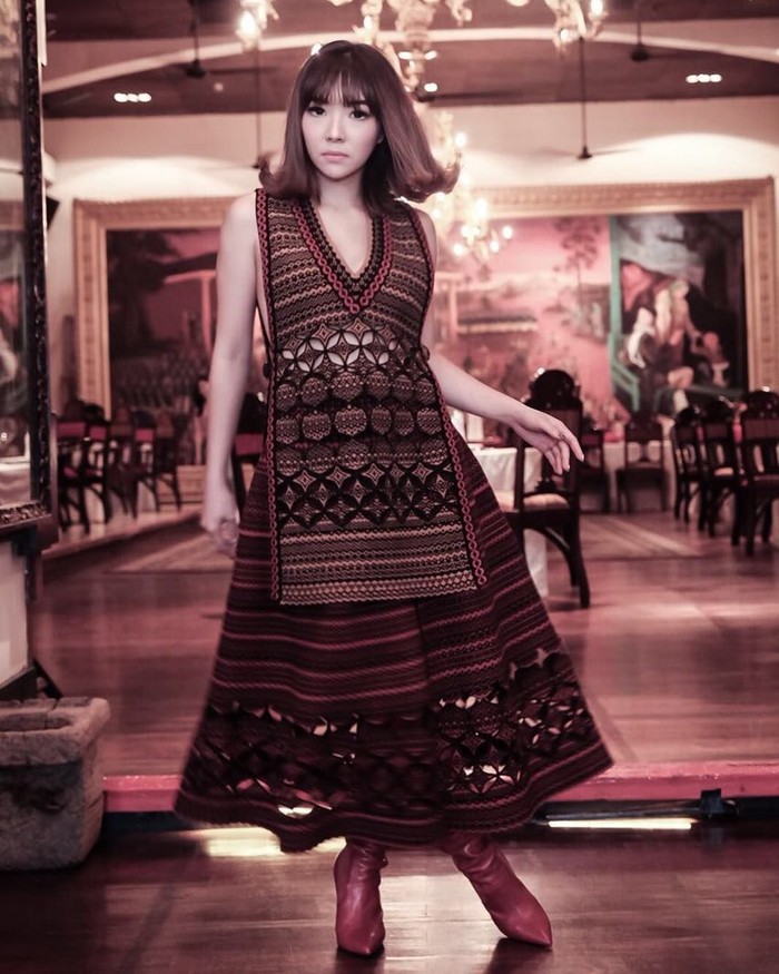 Gisell dan Shandy tampil berbalut gaun crochet yang sama. Padu padan antara vest dan rok midi tersebut datang dari label Fendi.