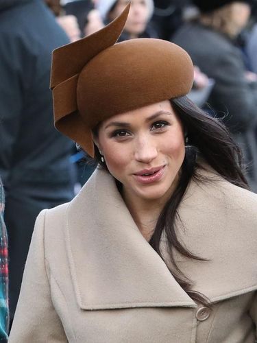 Meghan Markle mengenakan topi cokelat dengan aksen spiral di samping. Topi itu membuat bintang serial Suits itu jadi bahan ejekan netizen. Banyak yang menyebut topi Meghan mirip emoji gambar poop.
