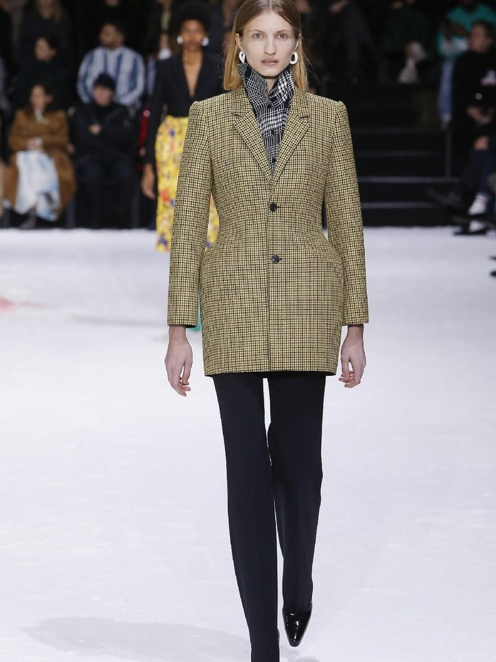 Demna Gvasalia, sang desainer, mengeluarkan para modelnya dengan outerwear berupa jaket hingga coat dengan pinggul yang melebar seperti jam pasir.