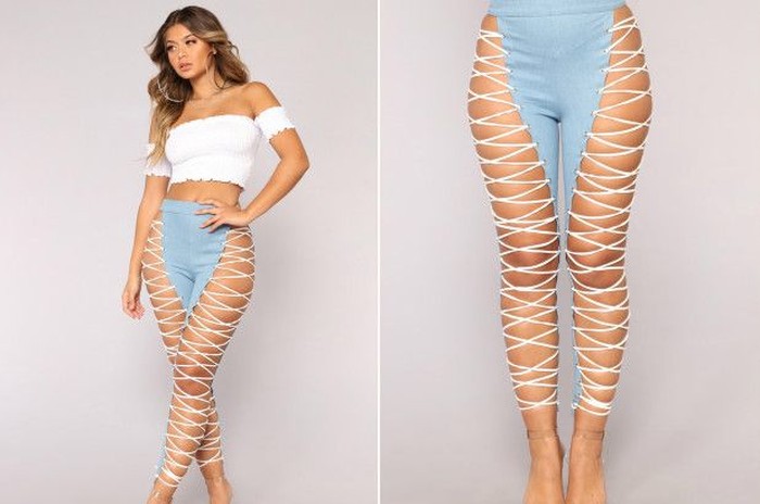 Fashion Nova, retailer asal California baru saja merilis jeans yang bagian depannya hanya tertutup lilitan tali. Celana yang dinamai Wild Thang lace-up jeans itu pun dijual dengan harga US$ 49.99 atau Rp 700 ribuan.