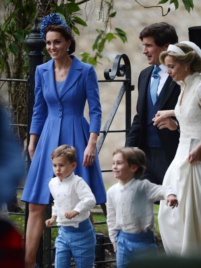 Duchess of Cambridge datang bersama Pangeran William, Pangeran George dan Putri Charlotte ke pernikahan sahabatnya, Sophie Carter di St Andrew's Church, Letheringsett, Norfolk. Biru menjadi warna pilihan keluarga ini.