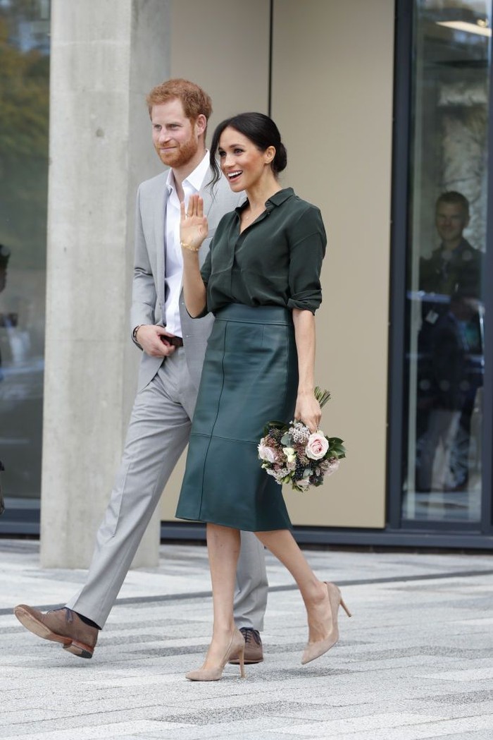 Meghan Markle tampil memesona ketika kunjungannya ke Sussex pekan lalu. Aksesori emas dipilih sebagai pelengkap busana bernuansa hijau emerald.