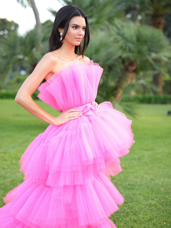 Kendall Jenner menjadi sorotan ketika ia melangkahkan kakinya di karpet merah amfAR Gala di Cannes mengenakan gaun tulle bubblegum pink. Gaun dengan bagian depan lebih pendek memperlihatkan kaki jenjang sang supermodel.