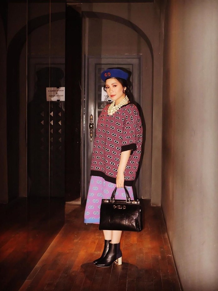 Dalam acara rehatnya sang suami Raffi Ahmad dari dunia entertainment itu Nagita Slavina tampil hits dengan tema fashion ungu dan hitam. Gigi, sapaan akrab Nagita tampil dengan blouse Gucci berbahan wool yang dibanderol seharga US$ 1/700 atau Rp 23.800.000. Bajunya itu dipasangkan dengan rok yang juga berbahan wool seharga US$ 1.400 atau Rp 19.600.000.