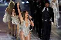 Jennifer Lopez dalam balutan gaun 'jaring laba-laba' karya Valdrin Sahiti. (Foto: Chris Pizzello/Invision/AP) |