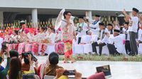 Fashion statement dari Sri Mulyani tampaknya tak berhenti pada kebaya saja. Busananya kian bermakna berkat warna rose gold yang menjadi palet utama, tak hanya baju kurung, tapi juga riasan wajah.