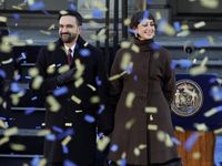 Untuk momen inaugurasi yang digelar setelah pelantikan, Rama Duwaji berbalut coat coklat dengan kerah bergaya funnel. Pilihan yang tepat untuk menghangatkan tubuh di perhelatan yang berlangsung di halaman Balai Kota itu.