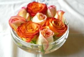 Caranya mudah saja. Siapkan mangkuk kecil. Transparan akan lebih cantik. Sediakan juga lima hingga enam batang mawar kecil. Kuncup pun tak masalah. Bentuk kelopaknya yang khas tetap terlihat cantik.