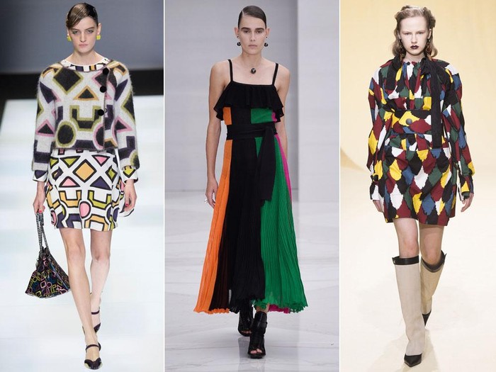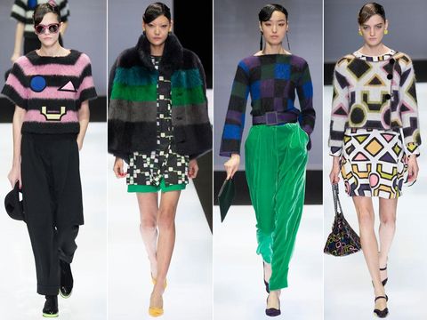 Giorgio Armani juga mengeksplor permainan color-blocking untuk koleksi musim dingin 2016 lini keduanya, Emporio Armani. Tetap dalam garis desain Armani yang classy dan elegan,color-blocking ditampilkan melalui permainan warna jewel-tone di dalam motif garis dan kotak.