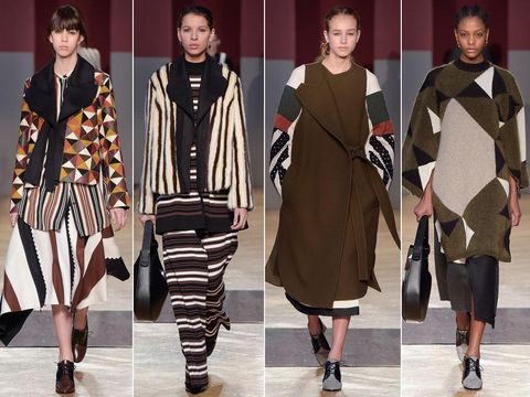 Brand yang satu ini menyuguhkan tren color-blocking dalam palet natural, dari coklat, krem, hingga hijau. Selain muncul dalam aplikasi panel, color-blocking sesekali tampil dalam motif geometris yang kuat.