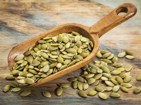 Biji labu yang dikeringkan merupakan makanan yang biasa disantap orang Meksiko. Biji dengan tekstur sedikit renyah tapi chewy ini cocok ditambahkan ke dalam oatmeal, yoghurt, sereal atau salad. Biji labu merupakan sumber yang baik bagi protein, asam amino, magnesium, zat besi dan serat. Beberapa perusahaan juga memproduksi biji labu sebagai camilan. Pilih yang dipanggang dan tidak mengandung garam untuk menjaga nutrisinya.