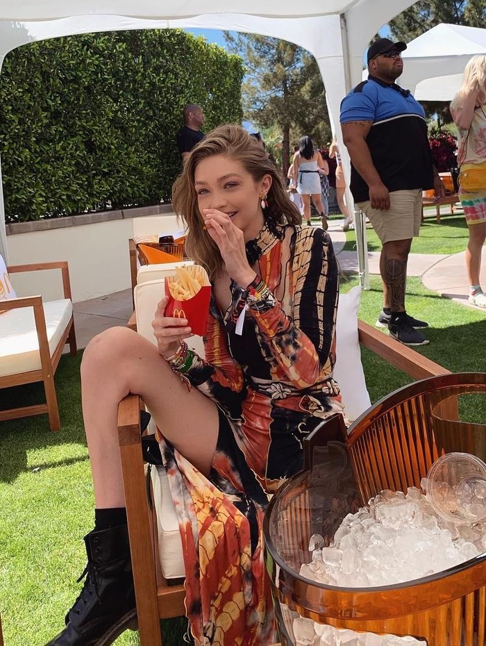 Dalam foto yang diunggahnya ke Instagram awal pekan ini, Gigi Hadid memamerkan gayanya makan kentang goreng McDonald di sela-sela keseruannya menghadiri festival musik Coachella. Dia berpose duduk di kursi kayu dengan kaki kanannya ditaruhnya di pegangan kursi. Tangan kanannya memegang bungkus kentang goreng. Di sampingnya ada es batu yang diletakkan di dalam wadah plastik.