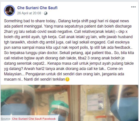 Hal itu yang membuat Che Suriani bertanya-tanya, ke mana mereka saat pihak rumah sakit sudah berkali-kali mencoba menghubunginya. Terakhir, Che Suriani mengingatkan bahwa ini adalah pelajaran bagi semua orang. Selalu berusaha memperlakukan keluargamu dengan baik, jangan sampai kamu nantinya menyesal.