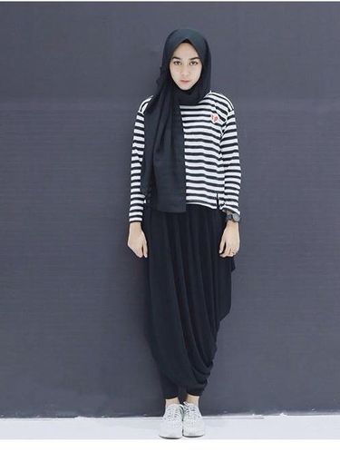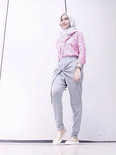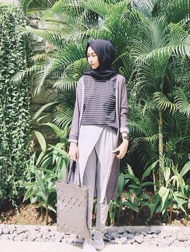 Celana modifikasi kali ini memiliki potongan menyilang pada bagian depannya. Celana berpalet abu-abu tersebut diterapkan Intan untuk tampil kasual. Lagi-lagi memakai striped blouse, gaya Intan kali ini dilengkapi dengan cardigan selutut serta sneakers. Setia dengan kreasi jilbab sederhana, hijab ala wanita Turki menjadi pilihannya di foto ini.
