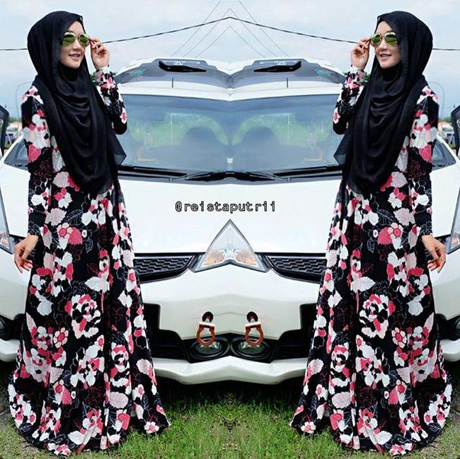 Reista memilih scarf segiempat dengan motif bunga-bunga. Pemakaiannya diaplikasikan secara sederhana hanya dengan dilipat segitiga lalu dibentangkan ke depan. Kerudung corak tersebut cukup dipadukan dengan gamis hitam agar lebih harmonis.