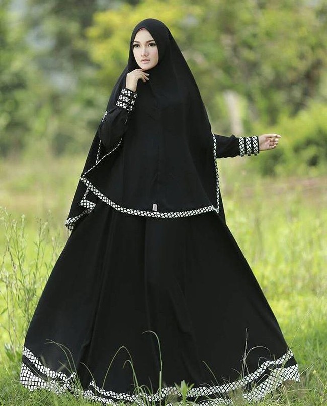Seperti kali ini, gamis kotak-kotak berpalet dasar navy blue dengan garis putih tersebut memiliki rok potongan flare di bagian bawah yang mampu menutup seluruh lekuk tubuhnya. Untuk membuat penampilannya lebih sopan, ia memakai jilbab instan yang warna birunya satu tingkat lebih muda agar terlihat serasi. Pilihan jilbab instan tersebut tetap tampak modern dengan aksen layer di bagian depan.