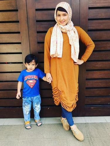 Tunik yang diberikan sentuhan unik bisa membuat penampilan lebih stylish. Intan mengenakan blouse warna biru muda yang cocok untuk ibu menyusui. Ia pun menerapkan jilbab yang panjang hingga dada. Jilbab panjang sampai dada cocok untuk ibu menyusui karena bisa dimanfaatkan sebagai apron. Kesan struktural ditonjolkan lewat penerapan kerudung motif.