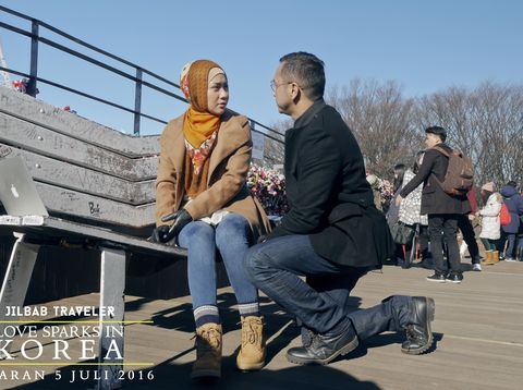 Ketika pergi traveling, terapkan jilbab simpel dari Dauky yang praktis dan memudahkan Anda untuk bergerak ke beberapa tempat. Seperti gaya jilbab BCL dalam satu adegan di 'Jilbab Traveler: Love Sparks in Korea' yang dilakukan di Korea. Perpaduan outerwear rajut cocok untuk traveling di musim dingin.