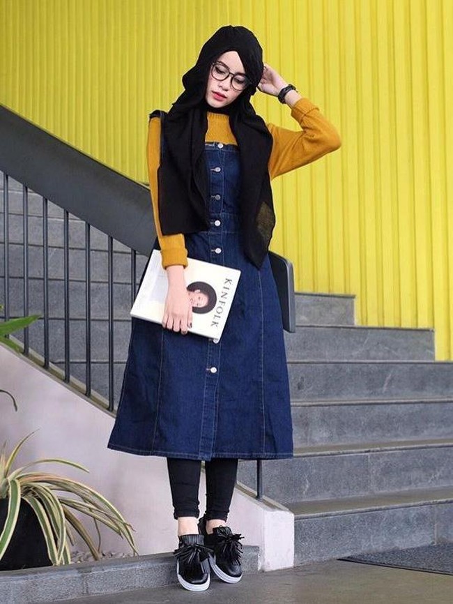 Bergaya preppy ala Aghnia Punjabi dengan mengaplikasikan jilbab seperti Hana Tajima. Perpaduan knitted blouse warna kuning gading serta midi dress berbahan denim membuat penampilannya tampak kasual namun urban. Wanita asal Malang itu menambahkan legging untuk menutup kulit kaki yang terekspos. Untuk bergaya ala si kutu buku, Aghnia menambahkan kacamata dengan bingkai bulat yang bertengger di atas hidungnya.