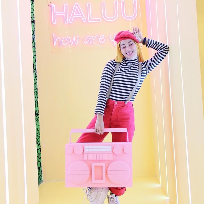 Penyuka motif polkadot itu juga berani memadukan potongan busana yang tak lazim seperti memakai celana piyama untuk hangout. Aksesori seperti topi baret, belt, dan sepatu boots jadi andalannya.