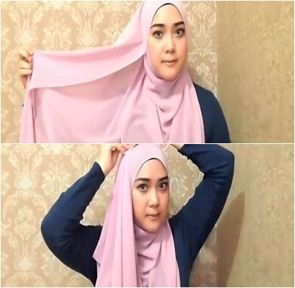 Sisi yang panjang dilipat sedikit ke arah dalam. Lalu ambil bagian tengahnya dan bawa ke atas kepala. Siapkan jarum kemudian sematkan di bagian atas.