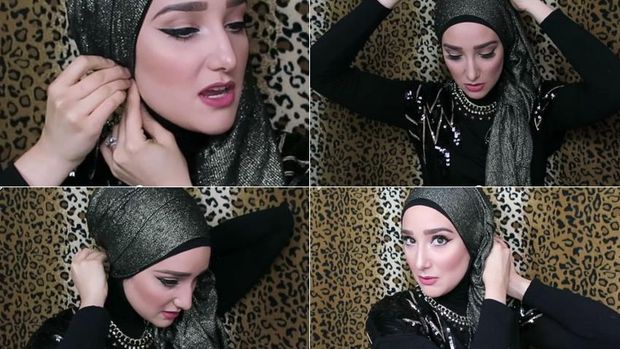 Pakailah ciput ninja terlebih dahulu. Pilih yang warnanya netral misalnya hitam seperti yang diaplikasikan oleh Yasemin. Ambil scarf panjang bergliter dengan warna yang sesuai selera Anda. Lalu letakkan di atas kepala dengan sisi kanan lebih pendek.