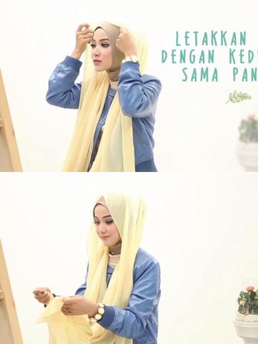 Ambil scarf sifon panjang lalu letakkan di atas kepala dengan kedua sisi sama panjang. Namun tak lupa menggunakan ciput ninja terlebih dahulu agar bagian leher tidak terekspos. Ambil jarum dan sematkan di atas kepala.