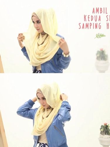 Sediakan aksesori berupa kalung panjang atau kalung statement. Kemudian pakailah seperti biasa namun pastikan kalung berada di atas scarf Anda.