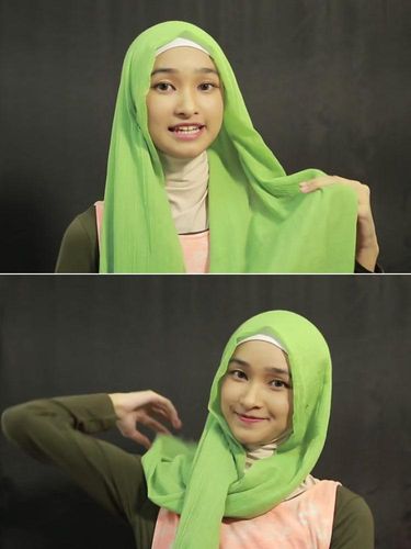 Siapkan scarf panjang, lipat sedikit bagian depannya, lalu letakkan di atas kepala dengan kedua sisi sama panjang. Tidak lupa menggunakan ciput ninja terlebih dahulu untuk menutup leher. Ambil dua jarum pentul dan sematkan di dekat telinga kiri serta kanan. Ingat, sematkan di bagian dalam ciput agar terlihat lebih rapi.