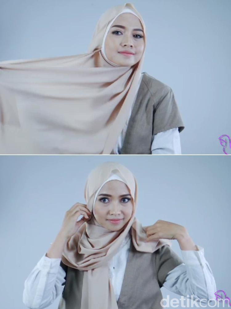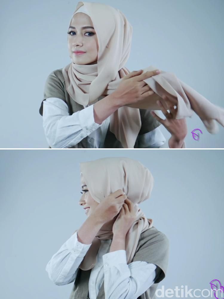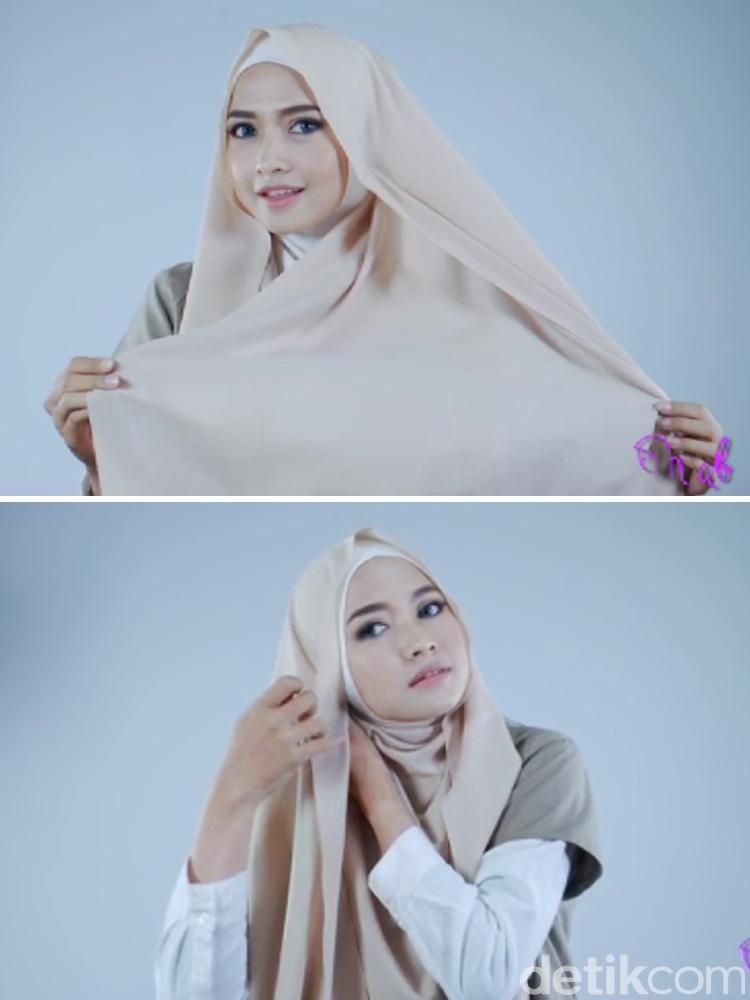 Ambil pashmina lalu letakkan di atas kepala. Pakai ciput terlebih dahulu agar hasilnya lebih rapi. Kemudian letakkan pashmina dengan salah satu sisi lebih pendek. Pandan memilih sisi yang kiri lebih pendek dari kanan. Kemudian sematkan jarum pentul di dekat telinga kiri dan kanan.