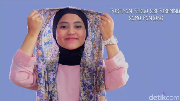 Siapkan pashmina dan lipat sisi depannya sedikit ke arah dalam. Kemudian letakkan di atas kepala dengan kedua sisi sama panjang. Agar tidak berantakan, jangan lupa pakai ciput terlebih dahulu ya. Untuk tutorial hijab ini, kurang disarankan menggunakan pashmina berbahan licin seperti satin, sutera, atau jersey yang sulit diaplikasikan tanpa jarum.