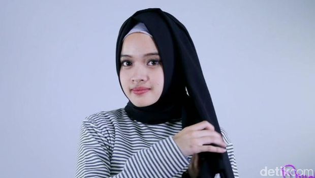 Sisi yang panjang dilipat ke atas kepala. Biarkan bagian ujungnya menggantung di atas pundak kiri. Lihat bagaimana Carla meletakkannya. Pastikan posisi tidak terlalu depan dan tetap rapi. Sisi yang pendek dibawa memutari leher. Pastikan posisinya 'mencekik' leher.