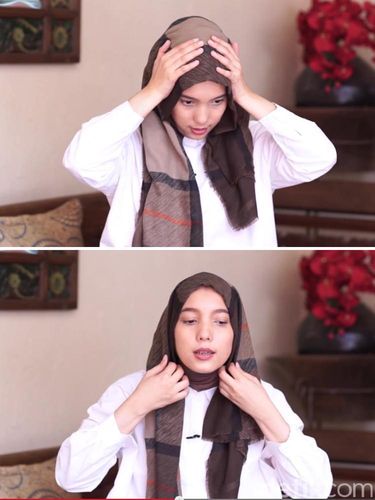 Siapkan scarf segiempat bahan katun lalu lipat menjadi dua bagian. Kemudian letakkan di atas kepala dengan sisi kanan lebih panjang. Ingat, tutorial hijab ini bisa tidak menggunakan ciput. Lalu lipat sedikit sisi kanan dan kirinya dan tarik lipatan ke bawah dagu, sematkan jarum pentul atau peniti di bawahnya.