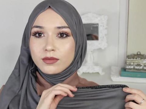 Ambil scarf berbahan jersey yang mudah diaplikasikan. Lipat sedikit pinggirannya. Lalu letakkan di atas kepala dengan salah satu sisi lebih pendek. Nabilaa memilih sisi kiri lebih pendek dari kanan. Satukan kedua bagian di bawah dagu lalu sematkan menggunakan peniti atau jarum pentul.