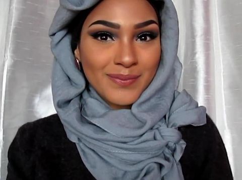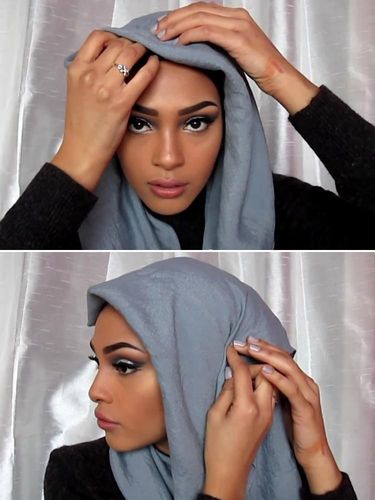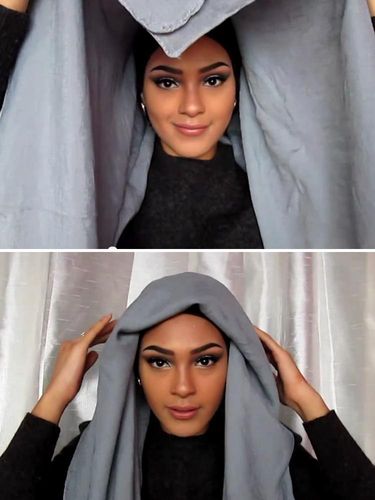 Pakailah ciput ninja terlebih dahulu yang menutup sampai leher. Kemudian ambil scarf segiempat warna netral dan lipat menjadi segitiga. Letakkan di atas kepala dengan posisi terbalik, jadi bagian ujung tengahnya berada di atas kepala.