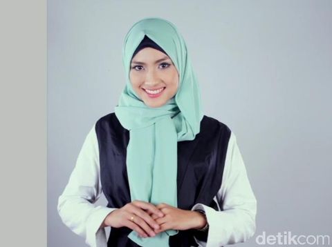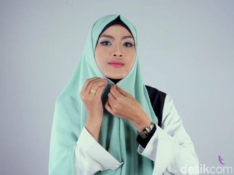 Siapkan pashmina berbahan satin warna cerah. Erra memilih palet tosca untuk menyemarakkan busana monokromnya. Sebelum memulai, pakailah ciput terlebih dahulu agar kerudung tidak mudah berantakan. Lipat sedikit bagian depannya lalu ltakkan pashmina di atas kepala dengan sisi kanan lebih pendek. Lipat kedua scarf ke arah depan, kedua sisinya tarik hingga menyatu di bawah dagu. Sematkan jarum di bawah dagu.