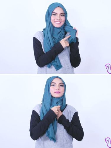 Ujung sisi yang tadi menggantung di atas pundak kiri diangkat lalu selipkan ke bawah scarf. Lakukan hal serupa pada sisi sebaliknya.
