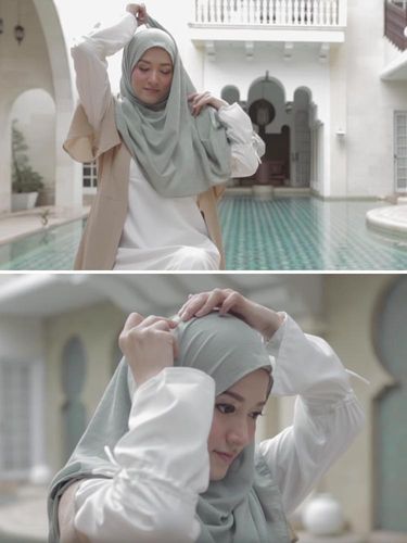 Siapkan scarf panjang atau pashmina lalu letakkan di atas kepala. Tidak lupa menggunakan ciput terlebih dahulu ya supaya kerudung tetap pada tempatnya dan rambut tak mudah keluar.