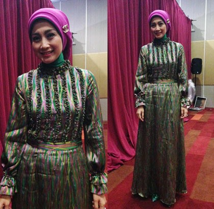 Saat tiba di lokasi, pada siang hari ini, Senin (4/5/2015), pukul 12.30, aktris yang populer di era 1990-an itu tampil cantik mengenakan terusan panjang dengan material satin yang memiliki detail di tengah dada. Penampilannya terlihat dengan gaya hijab sederhana menggunakan kerudung warna shocking pink. Tak lupa ia memakai riasan natural yang membuat wajahnya semakin ayu.