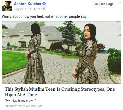 Dalam akun Facebook pribadi bintang film 'No Strings Attached' itu, Ashton menulis status mengenai pemberitaan Abrar yang berhijab tapi bisa terpilih sebagai siswi berbusana terbaik. Ashton menulis status berupa dukungan kepada Abrar disertai pemberitaan mengenai gadis yang berencana akan melanjutkan pendidikannya ke Rutgers University itu.