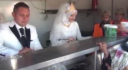 Esra tampak cantik dan anggun menggunakan gaun putih dilengkapi kerudung dan tudung pengantin warna off white. Sementara Fethullah memakai setelan jas dan celana putih yang dilengkapi dasi hitam. Kedua mempelai membagikan makanan kepada para pengungsi yang sudah antre panjang.