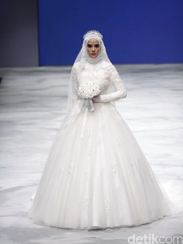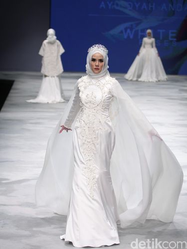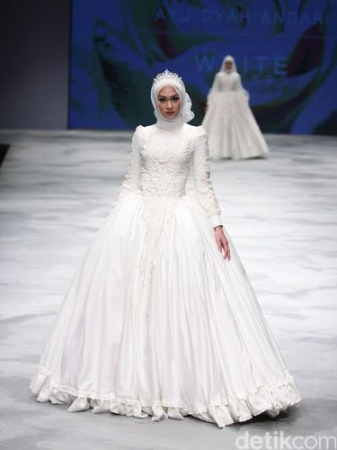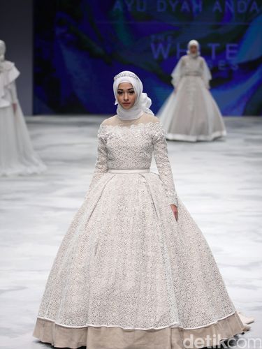 Selain Poppy Bunga, desainer Ayu Dyah Andari juga menggandeng blogger hijab yang tengah merinties karier sebagai penyanyi Indah Nada Puspita. Wanita kelahiran 14 Januari 1991 itu tampak seperti putri kerajaan dalam balutan busana pengantin berwarna putih. Detail hiasan bunga mawar putih di bagian dada membuat penampilannya tampak elegan.