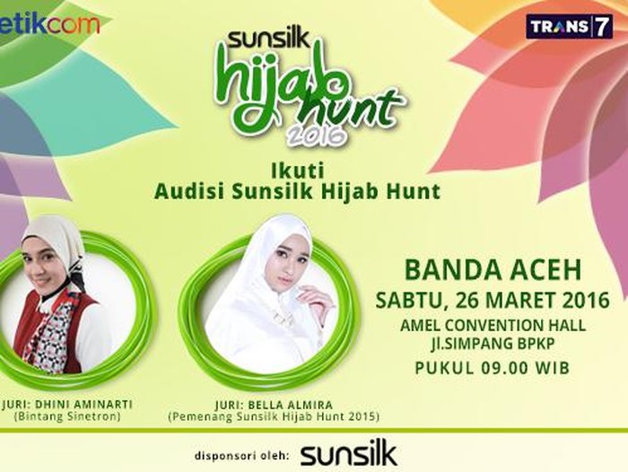 Audisi Sunsilk Hijab Hunt 2016 akan hadir di Aceh, Sabtu (26/3/2016). Bagi Anda hijabers Aceh dan sekitarnya yang memiliki bakat dan berpenampilan menarik, yuk ikut audisi Sunsilk Hijab Hunt 2016 yang digelar di Amel Convention Hall, Jl Simpang BPKP, Banda Aceh.