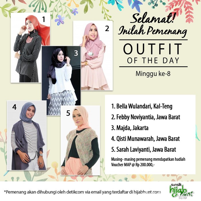 Hanya peserta Sunsilk Hijab Hunt 2016 yang bisa mengikuti kompetisi tersebut. Foto peserta Sunsilk Hijab Hunt 2016 terfavorit Wolipop bisa mendapatkan voucher MAP dengan total Rp 1 juta. Akan terpilih lima pemenang Hijab Hunt OOTD minggu ini. Siapakah hijabers pemenang Hijab Hunt OOTD minggu terakhir ini? Berikut nama-namanya:
