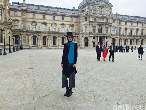Lokasi pemotretan tak hanya berlangsung di Museum Louvre tapi juga Menara Eiffel. Seperti pada foto ketika Iske memakai blouse putih polos, celana hitam, dan kerudung bergaris agar tak terkesan monoton.
